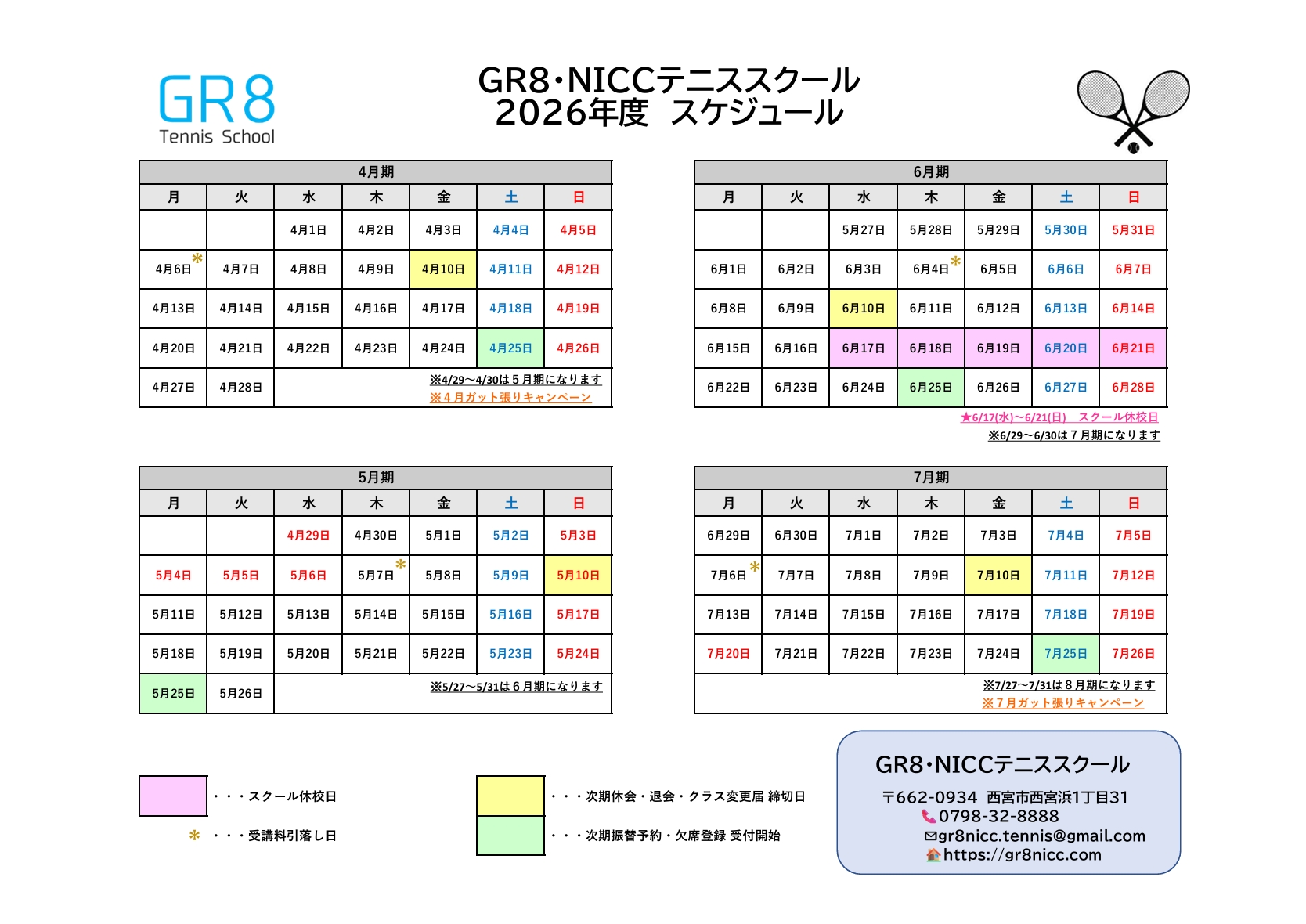 2026.4~7月期 スクールカレンダー📅 2026年3月1日 2026年3月1日 スクール生の皆様 2026年度 4月期~7月期のスクールカレンダーです。ご確認ください😊 フロントでも随時お配りしております。 ご不明な点はお気軽にフロントまでお問い合わせください。 2026.スケジュール(4~7月) 👈ダウンロード